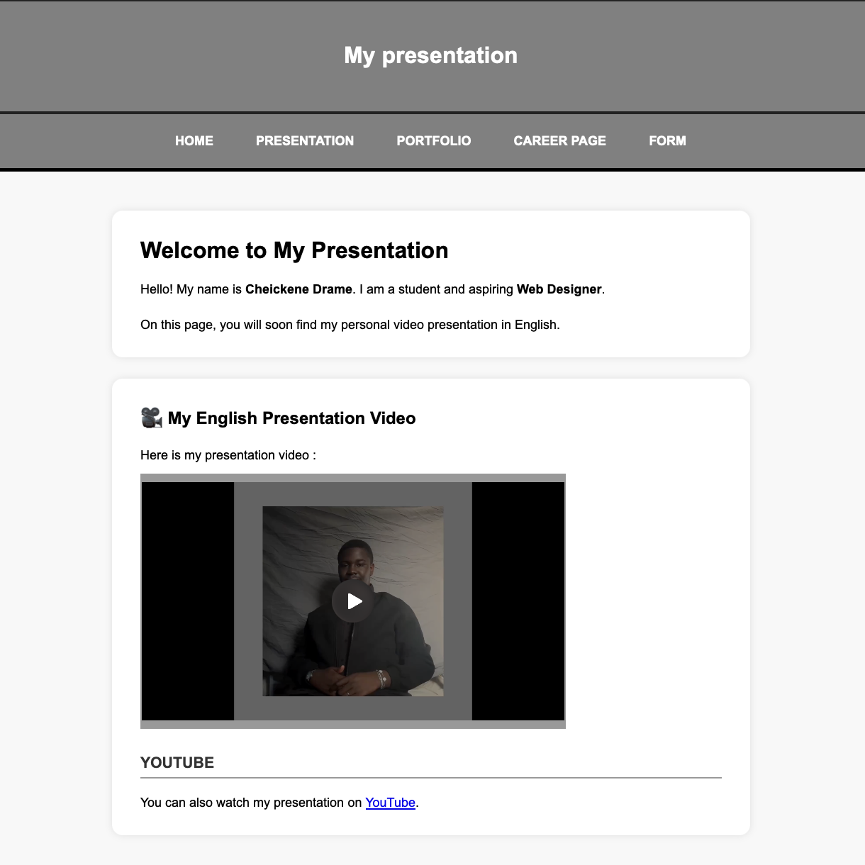 Ce projet de développement web est né de la volonté de concevoir et réaliser mon propre site professionnel, un outil complet centralisant mon CV numérique, mon portfolio et une présentation vidéo. Pour ce faire, j’ai mobilisé mes compétences techniques en HTML5 et CSS3